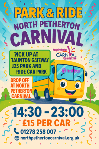 Due to the clearway, there will be NO PARKING en route this year. The North Petherton Carnival Committee have organised a park and ride service from the Taunton Gateway Park and Ride car park, which will take you to North Petherton at Huntworth Roundabout. There will be a short walk before you reach the carnival route. You can enjoy the carnival and then catch the bus back to your car at the end of the night. First Bus Company are providing the buses, and there is a 2M height restriction on the car park. It’s just £15 per car, and all money raised from this will go back into keeping carnival alive!