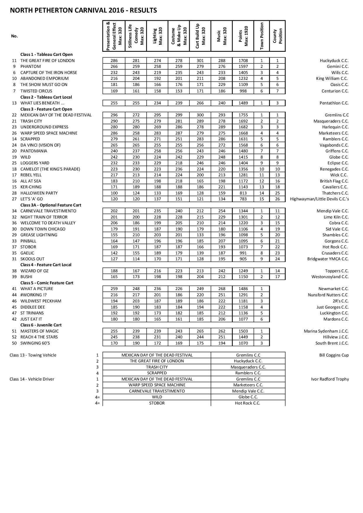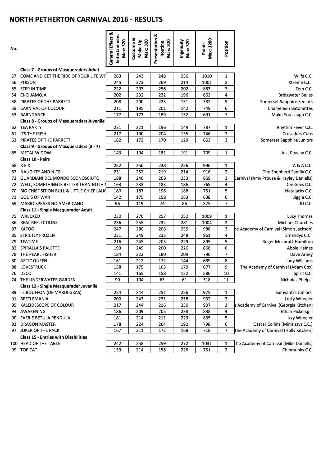 2016 – Results – Categories 1-6